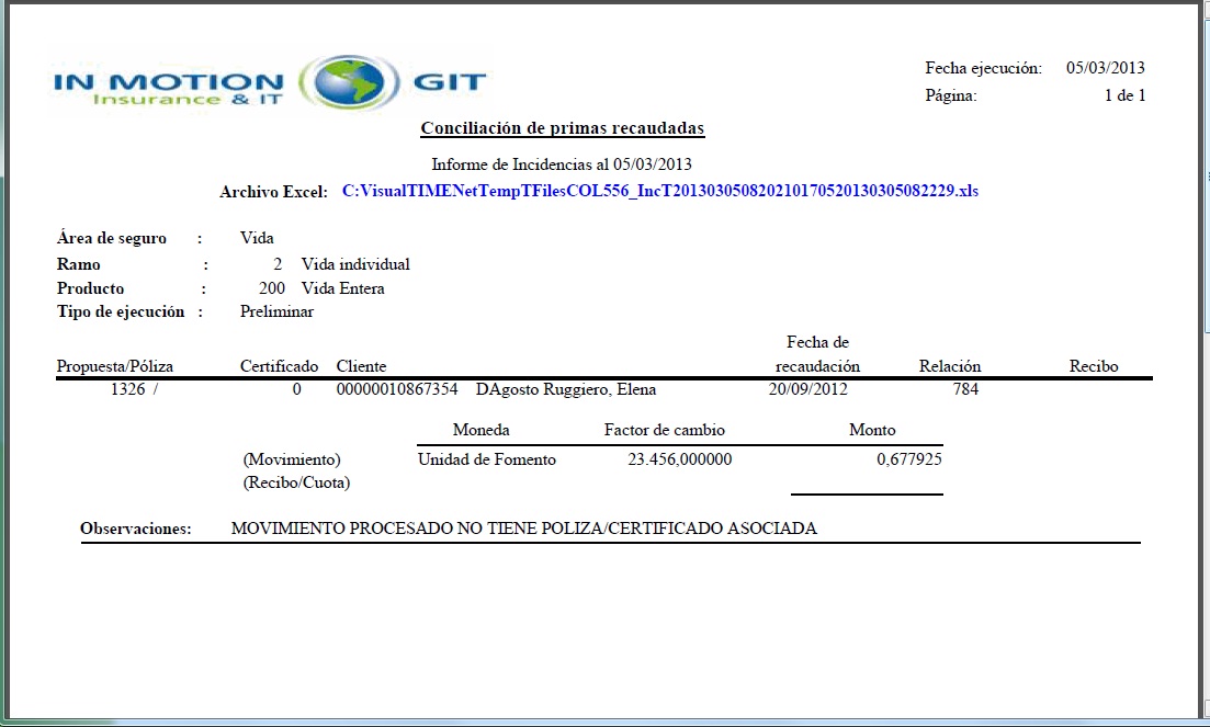 - Título: "Conciliación de primas recaudadas. Informe de cobros
